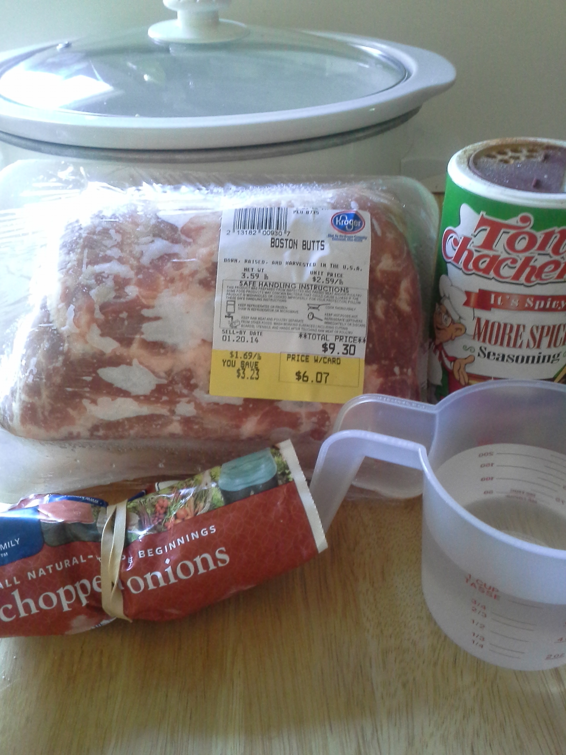 If you pre-purchased your meat (on sale, as I did) and froze it, make sure it is completely thawed. Generously coat all sides of the roast with the seasoning. Add onion and water to slow cooker; then add roast, fat-side up. Cover and cook on low 8-10 (or more) hours. You will know it is ready when the meat is falling apart. You should be able to easily remove the fat cap before removing the roast from the cooker. Then just shred and serve.