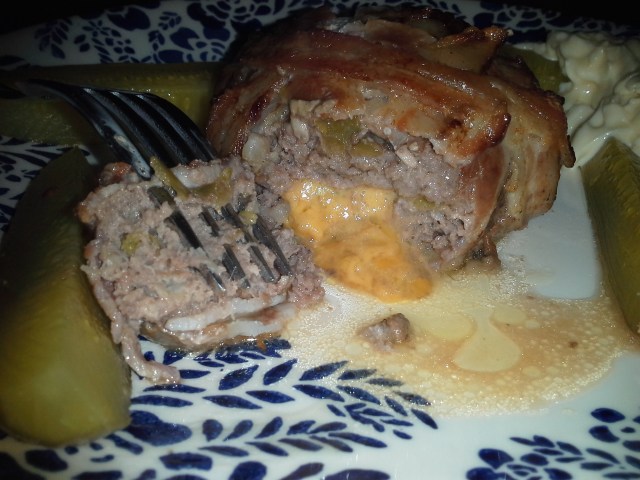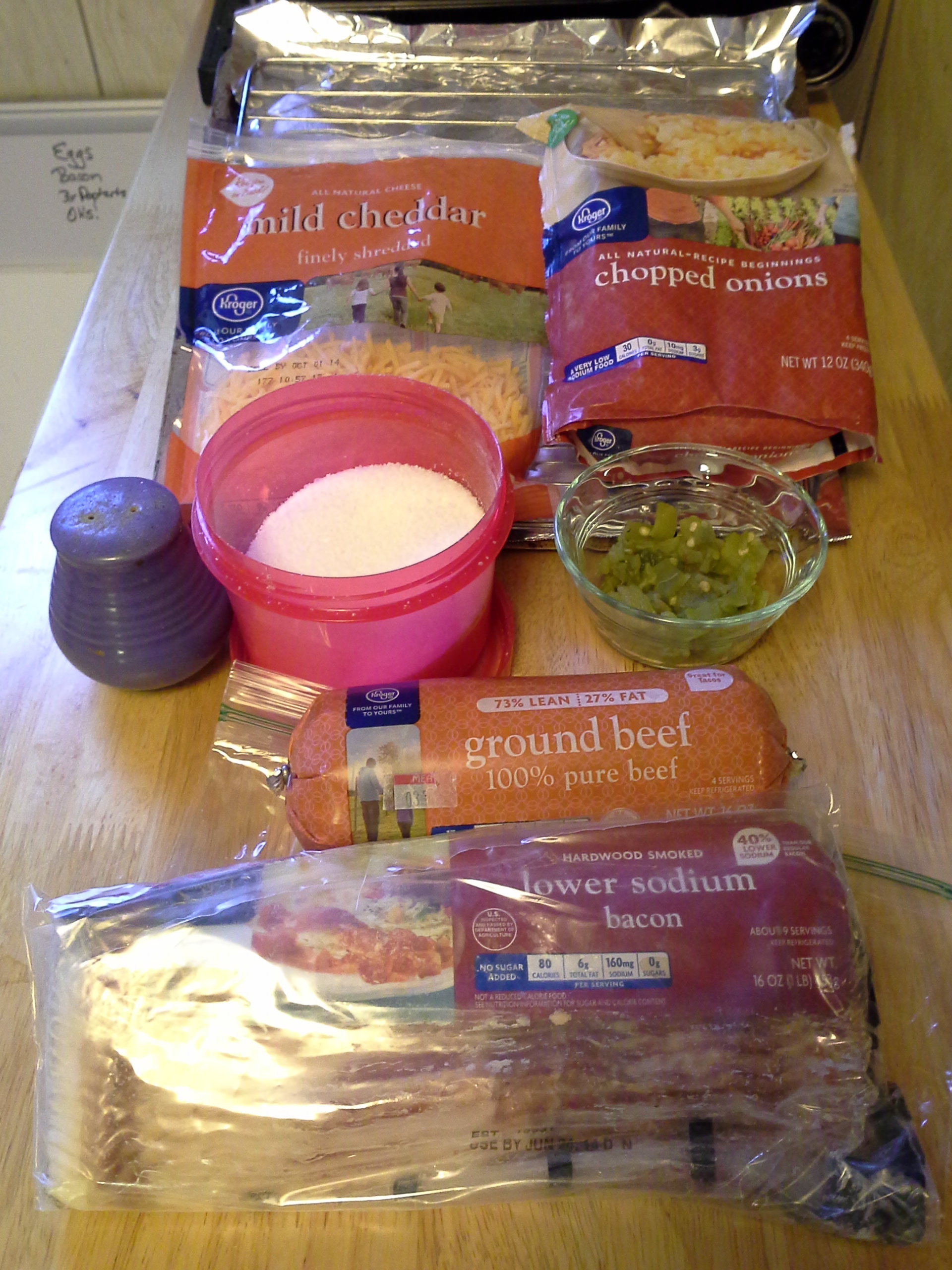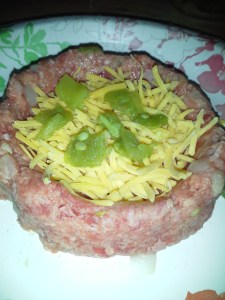 Preheat oven to 400–450°F (hotter for crisper bacon). In the bowl, combine meat, onion, green chile, salt, and pepper. I used frozen chopped onions, which helped keep the meat cold while I was handling it.