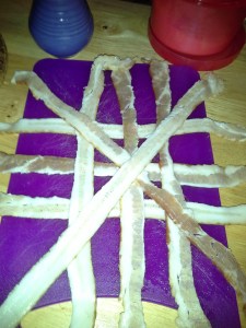 Cut the bacon slices in half lengthwise, then lay out in a grid on a flat surface as so: