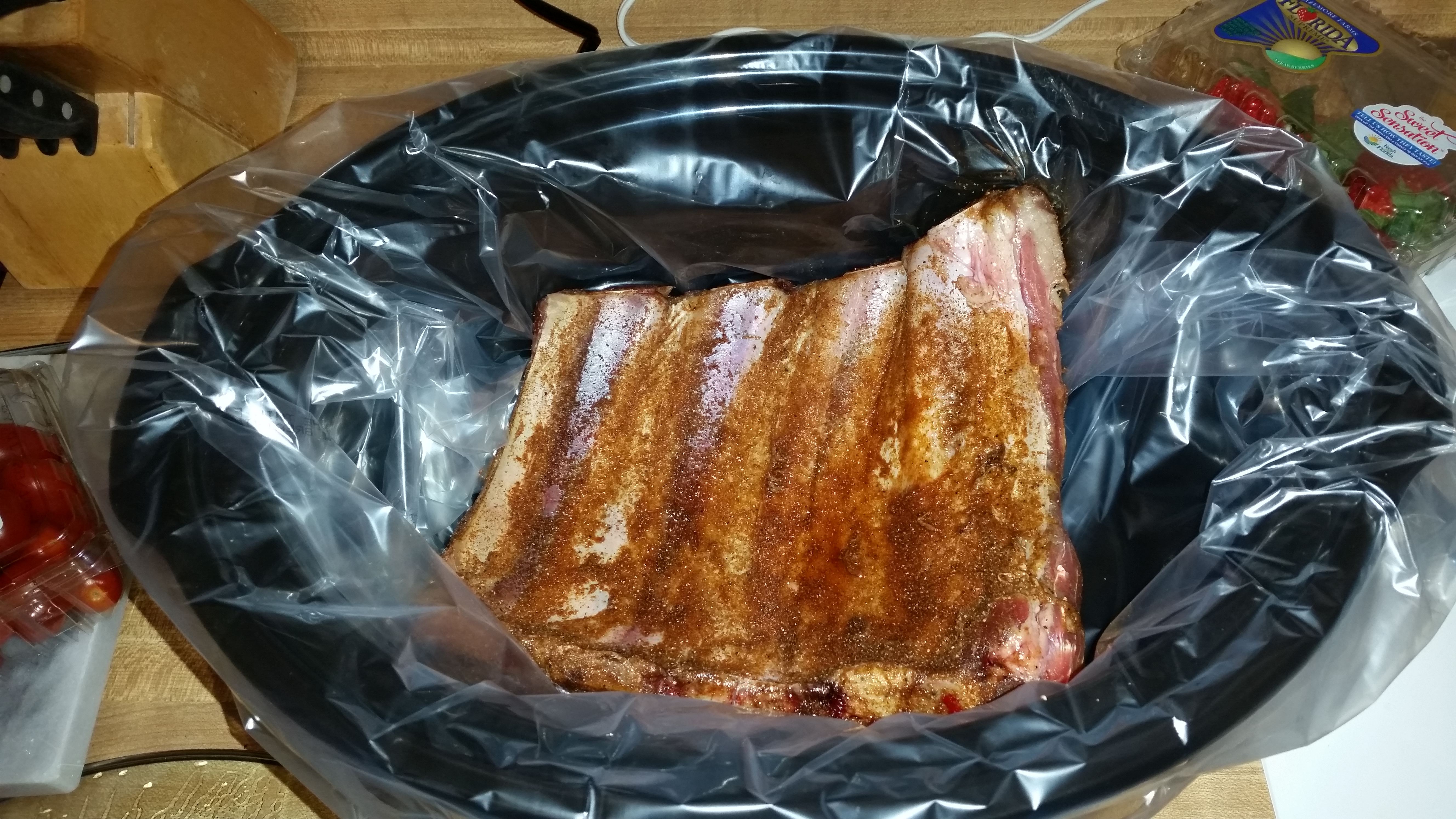 Place rib rack bone-side up in a lined slow cooker on low heat for 6 to 8 hours. Or, if you don’t have that much time (or aren’t that patient), on high for 4 hours.