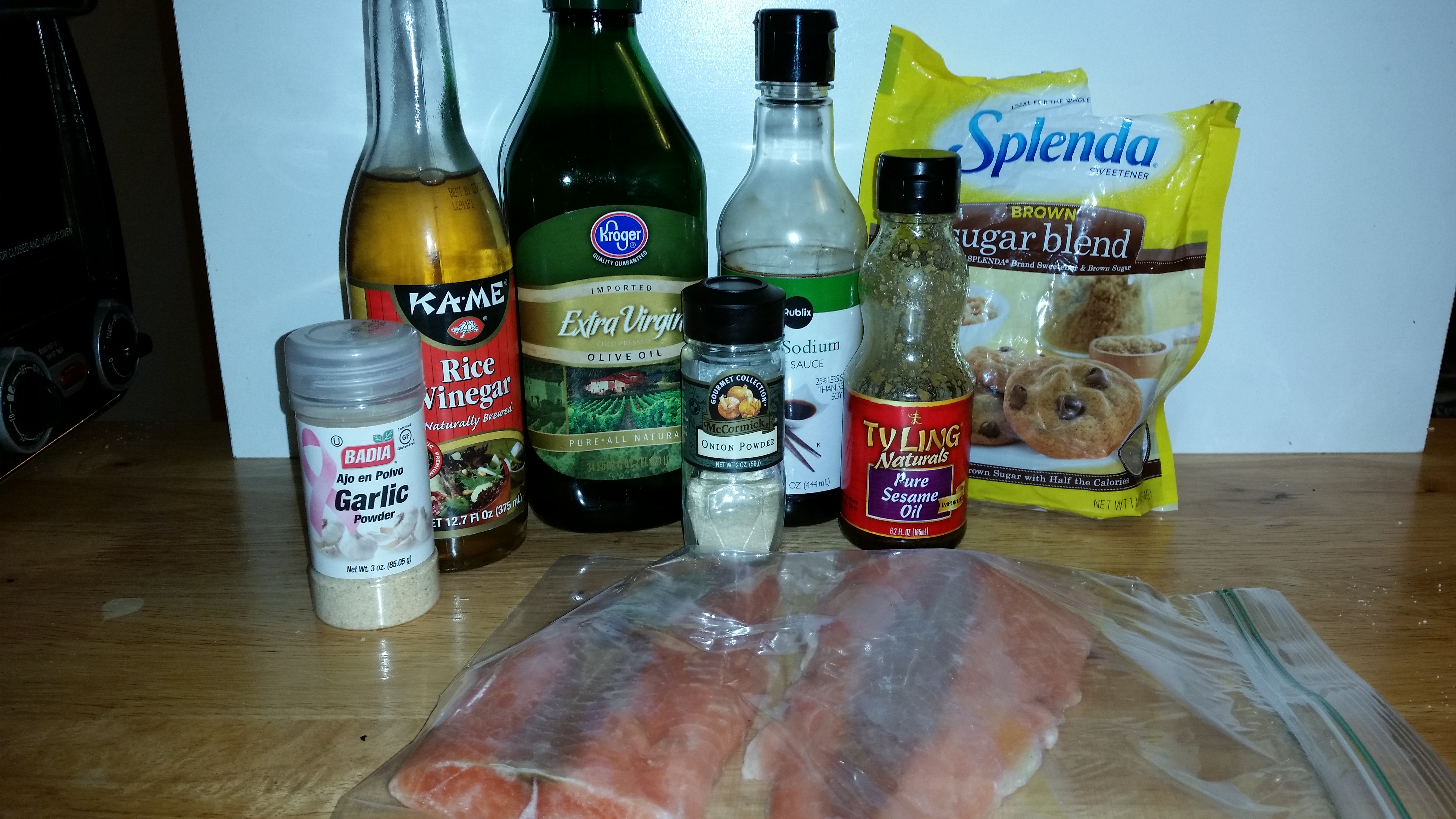 In a small bowl, combine oils, vinegar, soy sauce, sugar, garlic powder, and onion powder and whisk with a fork until well blended. Place salmon fillets in plastic bag, then pour marinade in. Seal bag, removing as much air as possible, and gently smoosh around to completely coat fillets. Put in fridge and let marinate 30 minutes to 2 hours.