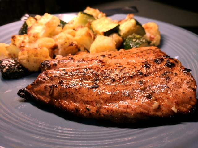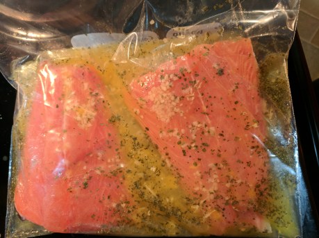 As mentioned in my previous post, I’m trying to follow the Activate cycle of the 17-Day Diet (visit that post to find out more about it). Which means finding new and tasty ways to make poultry and fish dishes, since those are the only meats allowed during this cycle. As I’m not really a big fan of fish (other than salmon, catfish, and tilapia), I’ve been trying to think of ways to make it that aren’t difficult and that are very tasty. Which led me to thinking about the marinades I’ve done here on the blog. One of my favorite was Orange-Lime Pork Chops, and I thought I could adapt it for salmon. And, boy howdy, was I right!